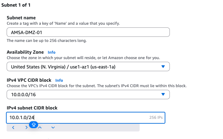 - AMSA-DMZ-01: Subxarxa pública a la zona us-east-1a. Aquesta subxarxa allotjarà la instància EC2 que farà de pont segur d’accés (mitjançant túnel SSH) per a la gestió de tots els recursos privats. (10.0.1.0/24).