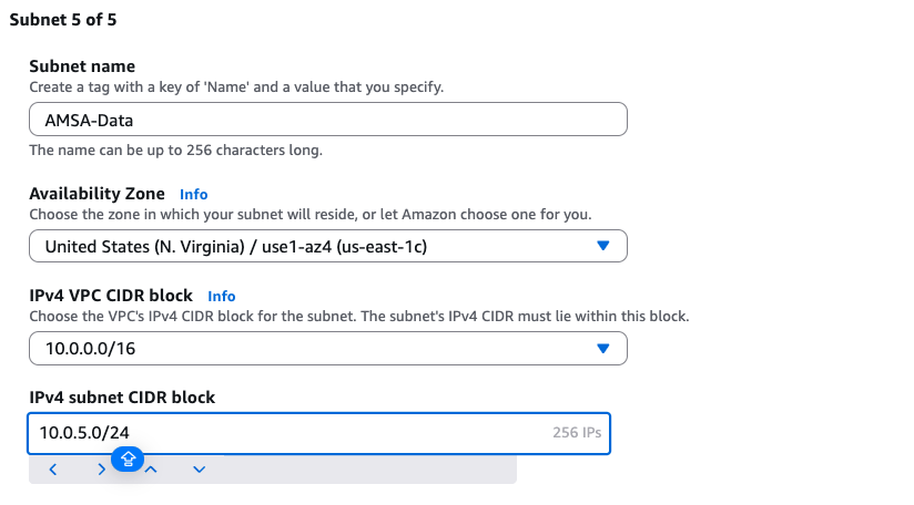 - AMSA-Data: Subxarxa privada per a dades a la zona de disponibilitat us-east-1c. (10.0.5.0/24)