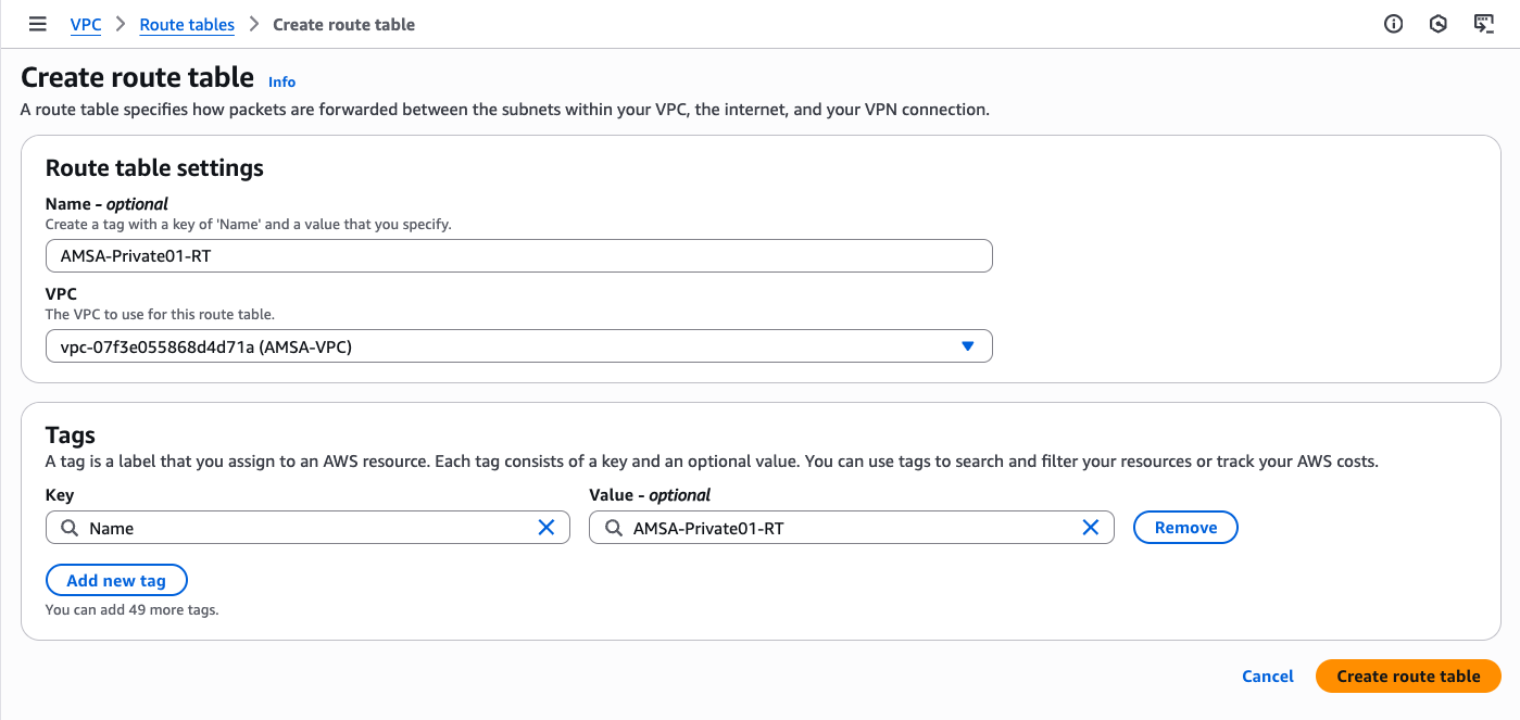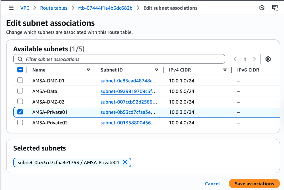 Crearem la taula de rutes (AMSA-Private01-RT) per a la subxarxa AMSA-Private01 i l’associarem a la subxarxa. Aquesta taula de rutes permetrà que les instàncies dins d’aquesta subxarxa accedeixin a Internet a través del NAT Gateway.
