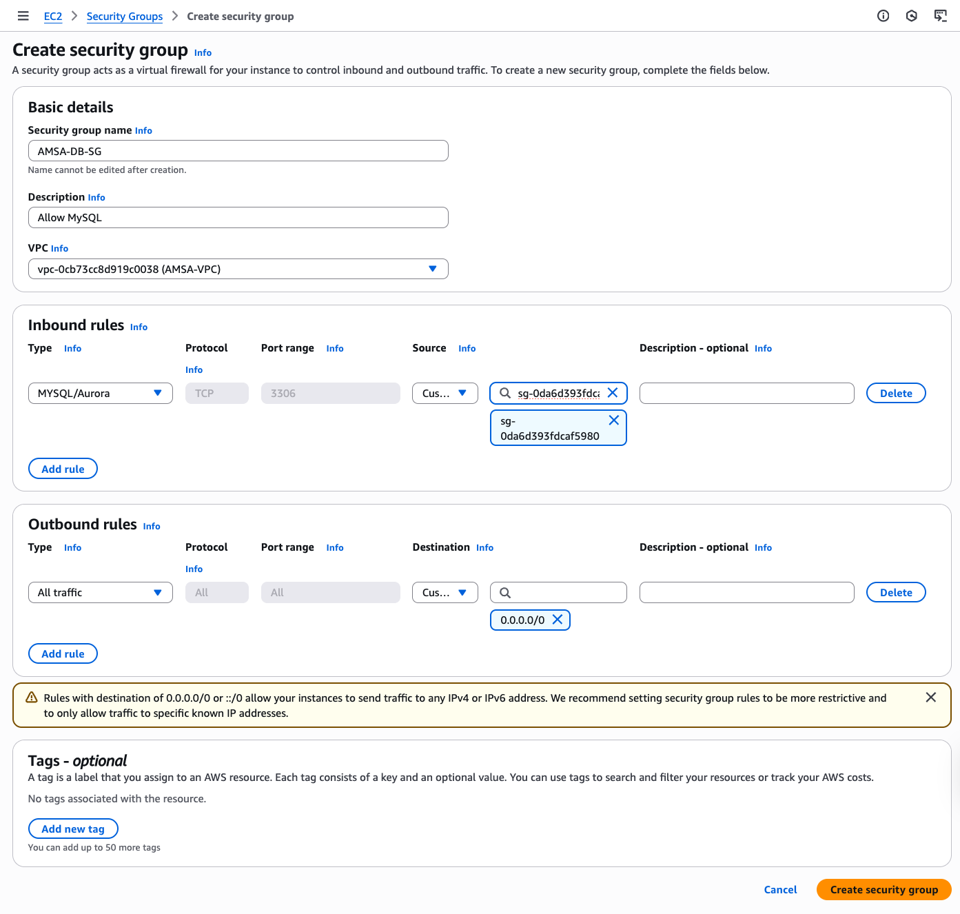 | AMSA-DB-SG | MySQL (3306) des de AMSA-Web-SG | Totes permeses |