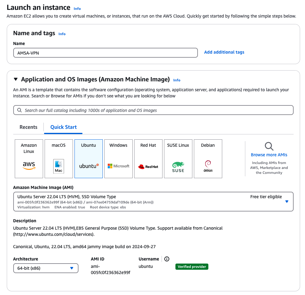 Per desplegar el servidor VPN, crearem una nova instància EC2 que actuarà com a servidor VPN. Aquesta instància EC2 haurà d’estar en una subxarxa pública connectada a interent. Anomenarem aquesta instància AMSA-VPN i la situarem a la subxarxa pública AMSA-DMZ-01. Aquesta instància EC2 utilitzarà el grup de seguretat AMSA-VPN-SG que permetrà el tràfic necessari per al funcionament del servidor VPN.