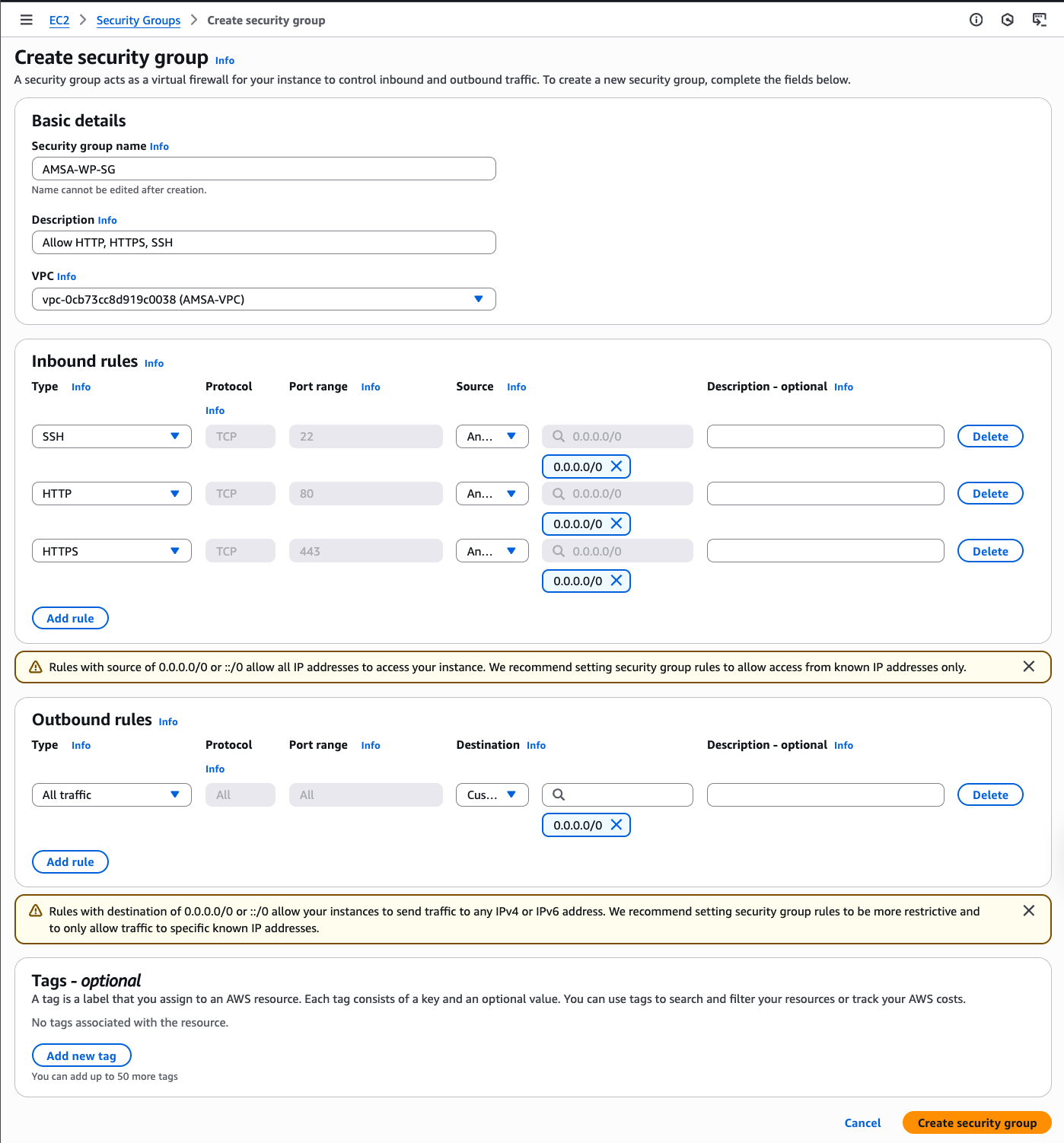 | AMSA-WP-SG | HTTP (80) i HTTPS (443) des de 0.0.0.0/0; SSH (22) des de 0.0.0.0/0 | Totes permeses |