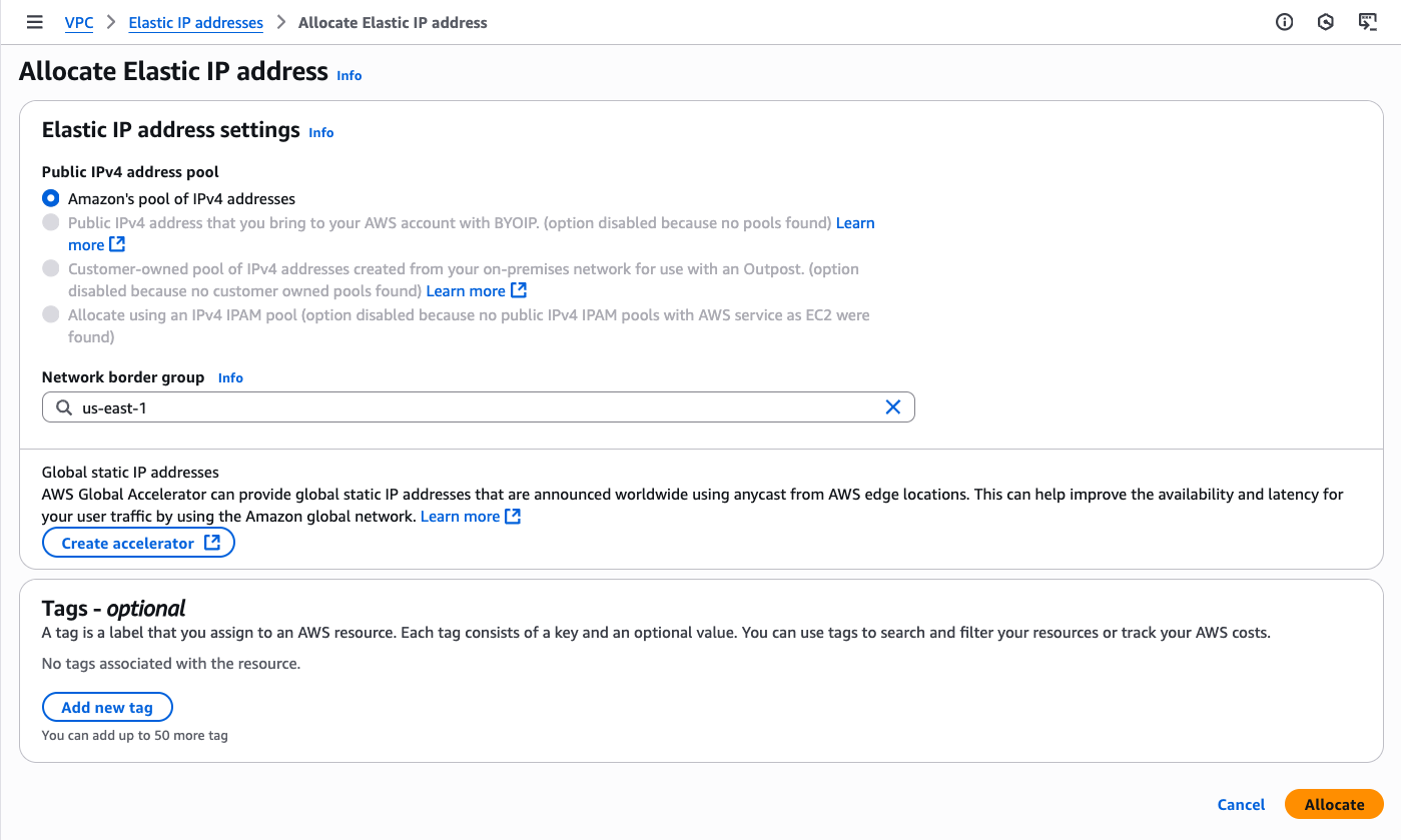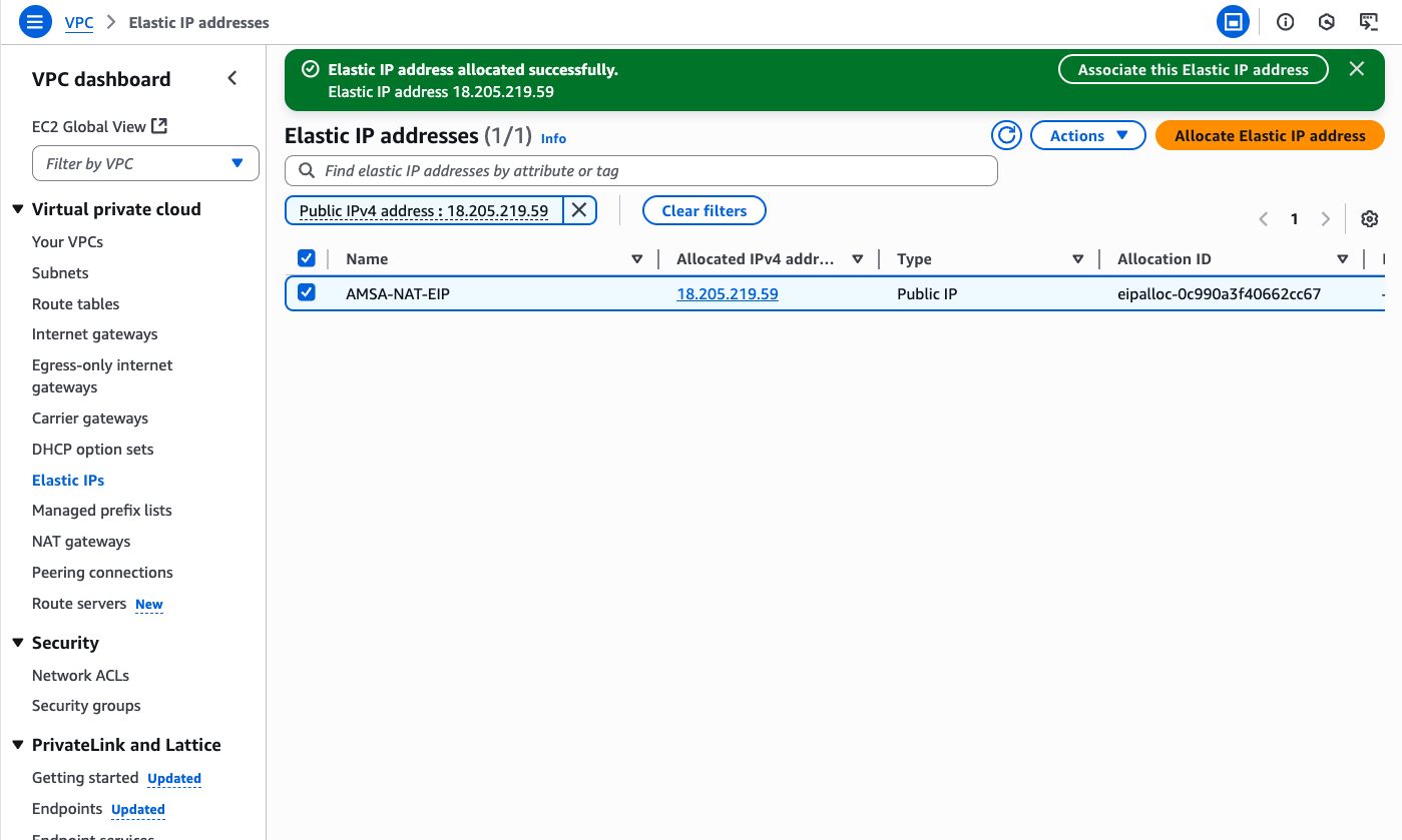 Per crear el NAT Gateway, necessitem una IP elàstica (Elastic IP). Per tant, primer crearem una IP elàstica i després la utilitzarem per crear el NAT Gateway. L’anomeneu AMSA-NAT-EIP.