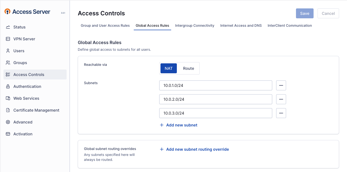 Configuració de Split Tunnel Aneu a Access Controls/Global Access Rules i afegiu una regla per permetre el tràfic de la VPN a les subxarxes de la VPC: