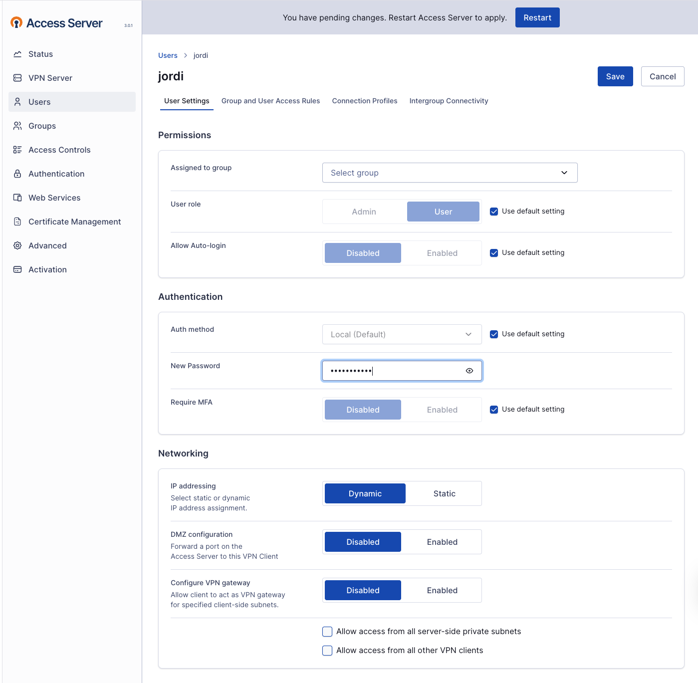 Creació d’un usuari per al servidor VPN Un cop tinguem el fitxer de configuració, ja podeu fer un Restart del servei OpenVPN per aplicar tots els canvis. Torneu a accedir a la interfície web del servidor OpenVPN.