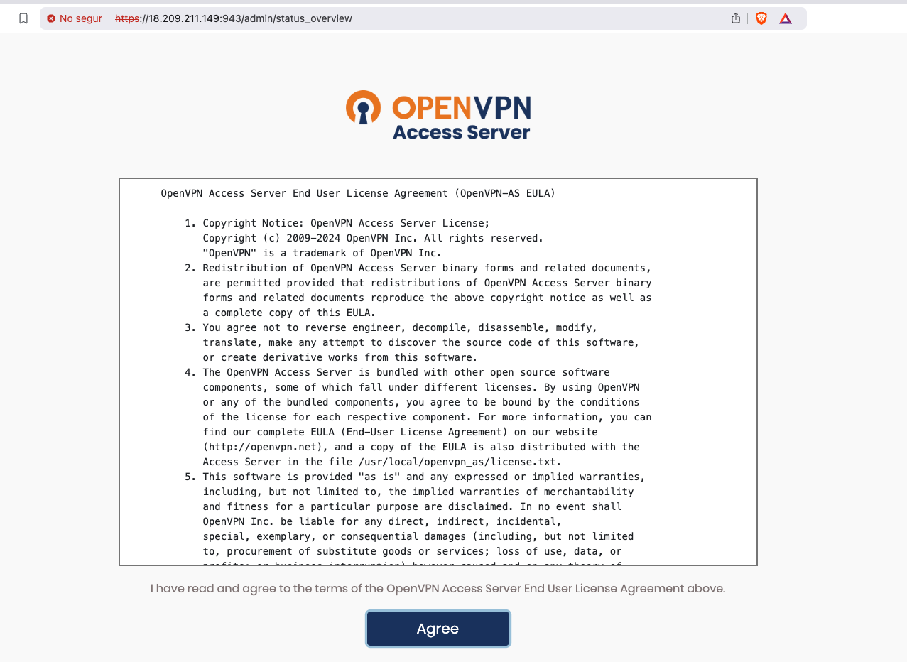 Interfície web del servidor OpenVPN - Accepteu els termes de llicència.