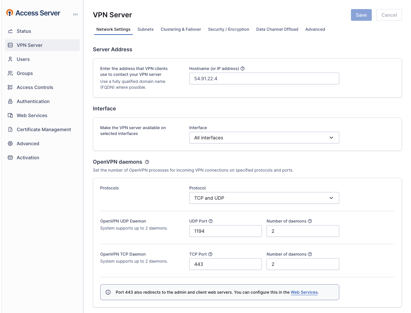 Acceptació dels termes de llicència Aneu a VPN Server/Network Settings i configureu el Hostname or IP Address amb la IP pública de la instància EC2 on teniu el servidor OpenVPN. Un cop fet, clicareu a Save.