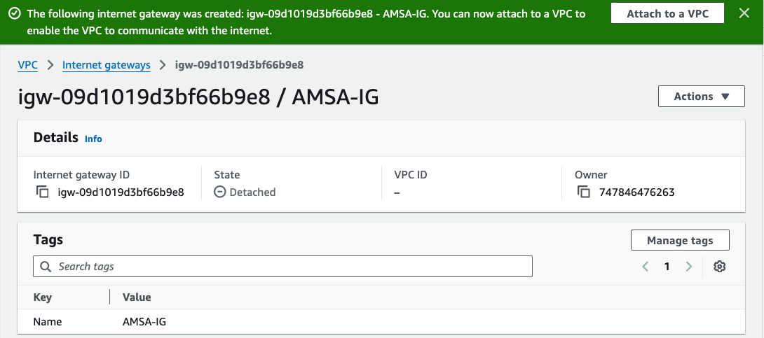 El primer pas és crear el Gateway d’Internet. Aneu a VPC → Internet Gateways → Create internet gateway. Un cop creat, l’anomeneu AMSA-IG.