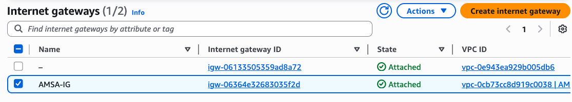 Utilitzarem un Gateway d’Internet (IGW) per permetre que les subxarxes públiques (AMSA-DMZ-01 i AMSA-DMZ-02) tinguin accés a Internet tant per a tràfic entrant com sortint. Per fer-ho, primer crearem el IGW i després l’associarem a la nostra VPC.