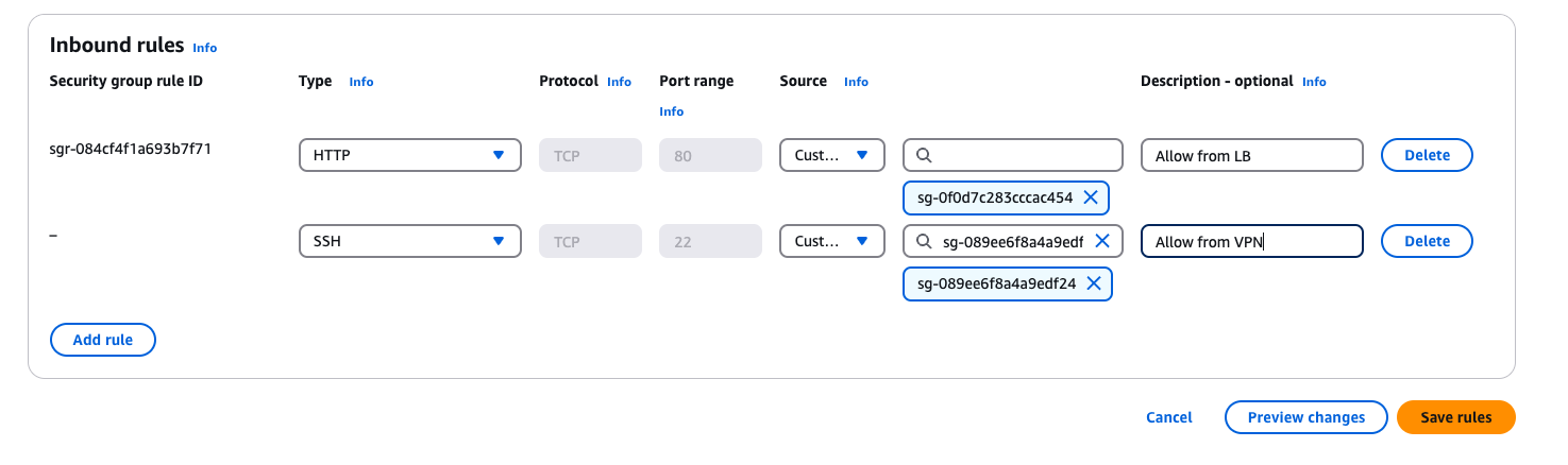 Un cop tot configurat, actualitzarem el grup de seguretat de les instàncies EC2 per permetre el tràfic al port 22 únicament provinent del servidor VPN. Això significa que les instàncies EC2 només acceptaran tràfic SSH del servidor VPN i no de qualsevol altre origen.