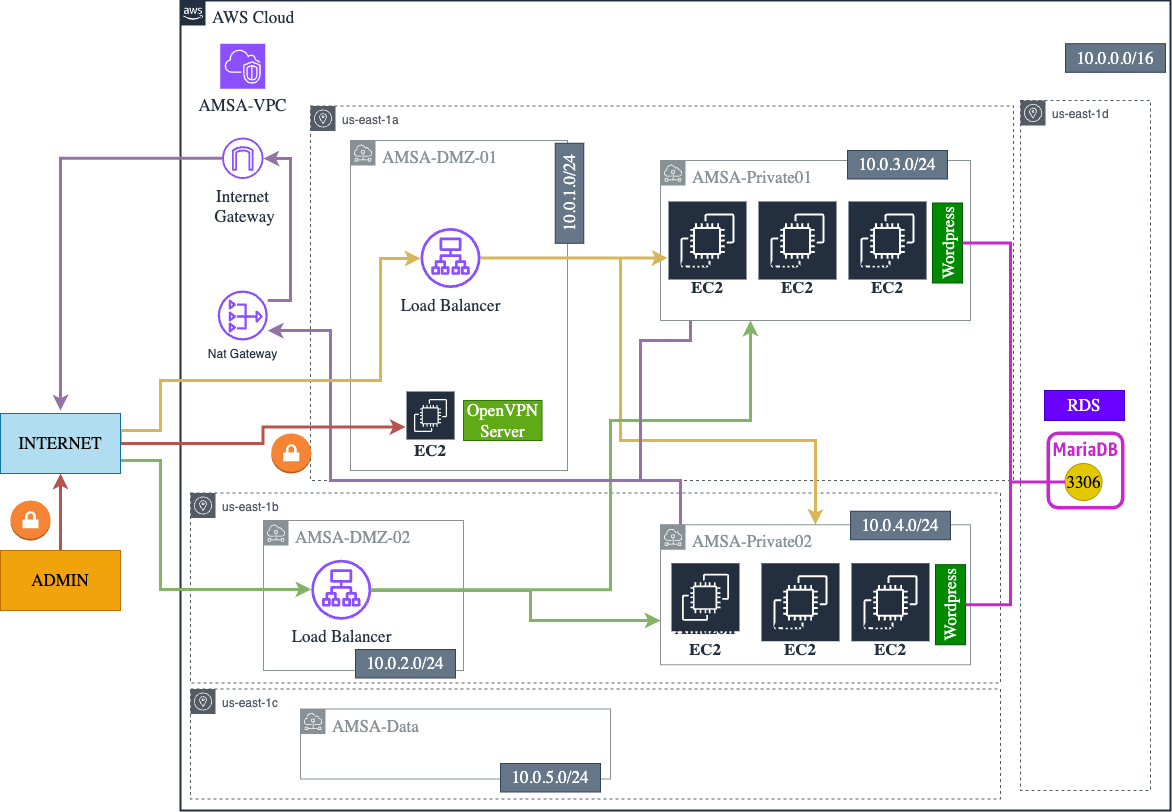 - AMSA-Private01: Subxarxa privada per a les instàncies de WordPress a la zona de disponibilitat us-east-1a. (10.0.3.0/24).