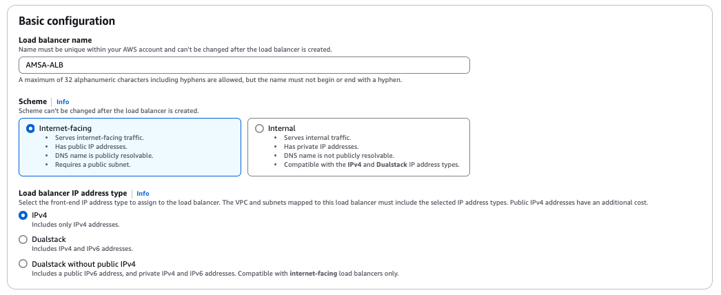 Existeixen 3 tipus de balancejadors de càrrega a AWS: Application Load Balancer (ALB), Network Load Balancer (NLB) i Gateway Load Balancer (GWLB). En aquest cas, utilitzarem un Application Load Balancer (ALB), ja que és el recomanat per a aplicacions web que utiltizen HTTP i HTTPS.
