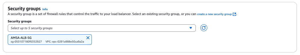 Grups de Seguretat: Nou grup de seguretat (AMSA-ALB-SG), aquest grup de seguretat permetrà el tràfic d’entrada per als ports 80 (HTTP) i 443 (HTTPS) des de qualsevol origen però restringirà el tràfic de sortida a les instàncies EC2 (grup de seguretat AMSA-WP-SG).