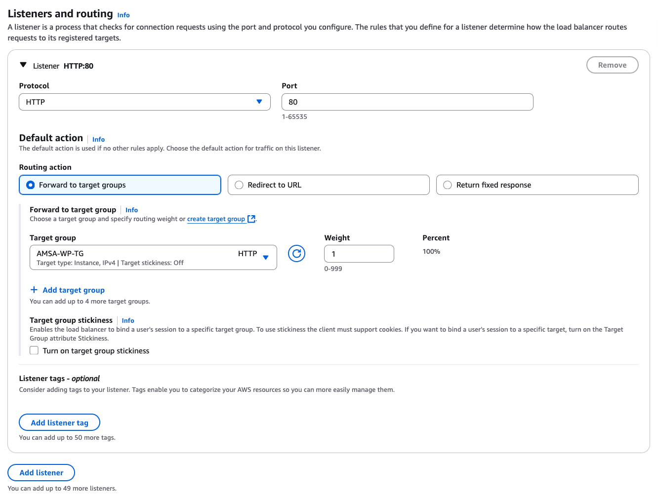 Configuració del target group Un cop creat el target group, el seleccionarem com a target del listener del balancejador de càrrega.