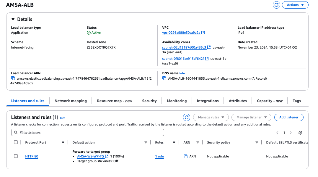 Availability Zones: Seleccionar les zones de disponibilitat on tenim la subxarxa pública AMSA-DMZ-01 (us-east-1a) i les AMSA-DMZ-02 (us-east-1b).