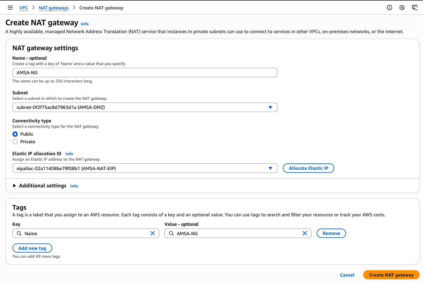 Un cop tenim la IP elàstica, podem crear el NAT Gateway. L’anomeneu AMSA-NG i l’associeu a la subxarxa AMSA-DMZ-01.