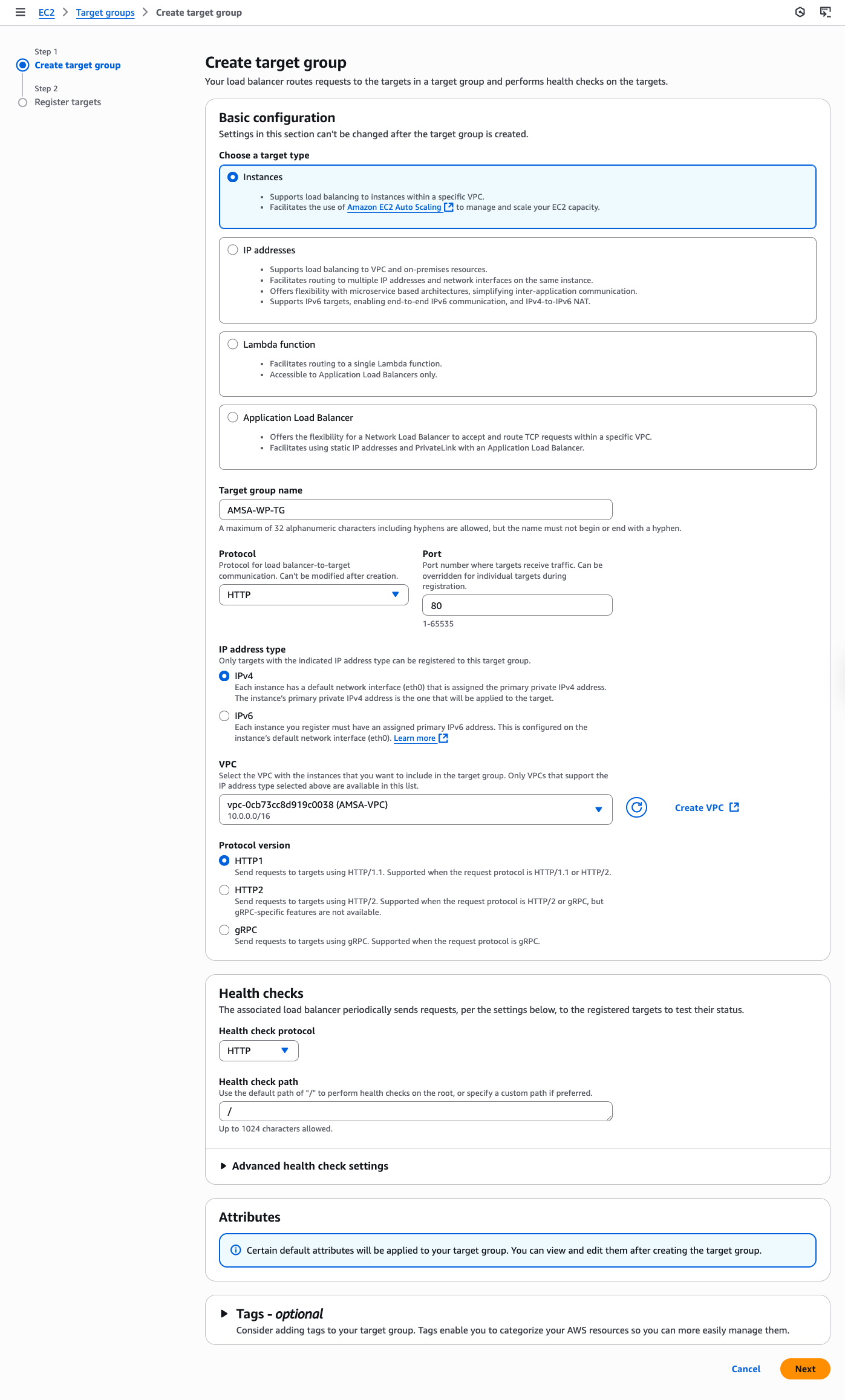 El balancejador de càrrega comprova la salut de les instàncies EC2 a través del port 80 i la ruta /. Això significa que el balancejador de càrrega enviarà tràfic a les instàncies EC2 que responguin correctament a les peticions HTTP a la ruta /. Com que les nostres instàncies EC2 tenen WordPress instal·lat, aquestes instàncies respondran correctament a les peticions HTTP a la ruta /. Podem deixar la configuració per defecte. La instal·lació de WordPress inclou una pàgina d’inici que respondrà amb 302 (Found) quan s’accedeixi a la ruta arrel (/), per això pot passar que el health check mostri que la instància no està saludable. Un cop configurat el WordPress, el health check mostrarà que la instància està saludable.