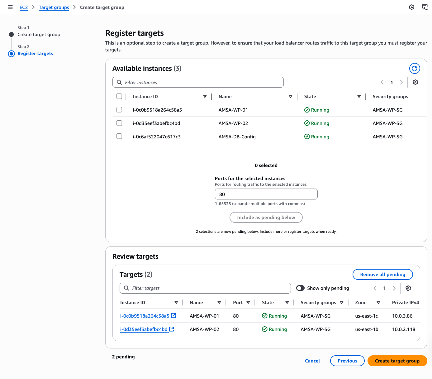 Seleccionarem les dos instàncies EC2 que allotgen WordPress (AMSA-WP-01 i AMSA-WP-02) i les afegirem al target group. Utilitzant el botó Include as pending below i després Add to registered.