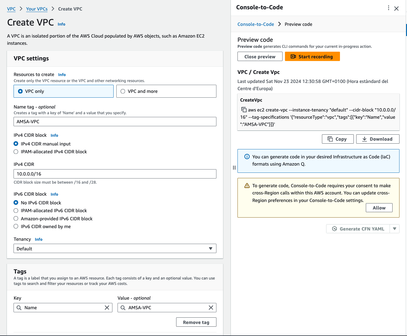 Podem definir la VPC a través de la interfície web d’AWS, utilitzant els formularis disponibles: