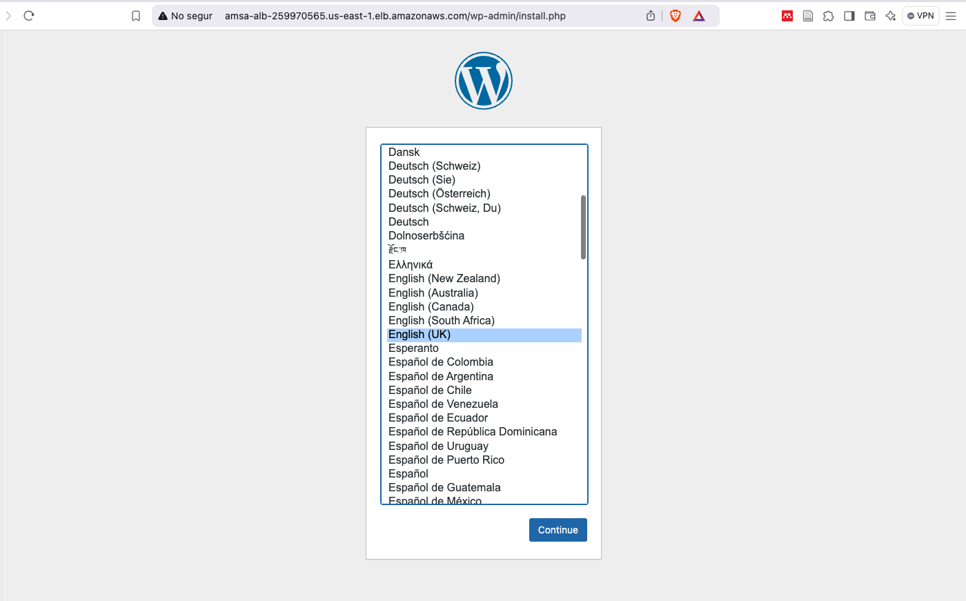 - Ara ja podem accedir al balancejador de càrrega a través de la seva adreça DNS i veure la pàgina d’instal·lació de WordPress: