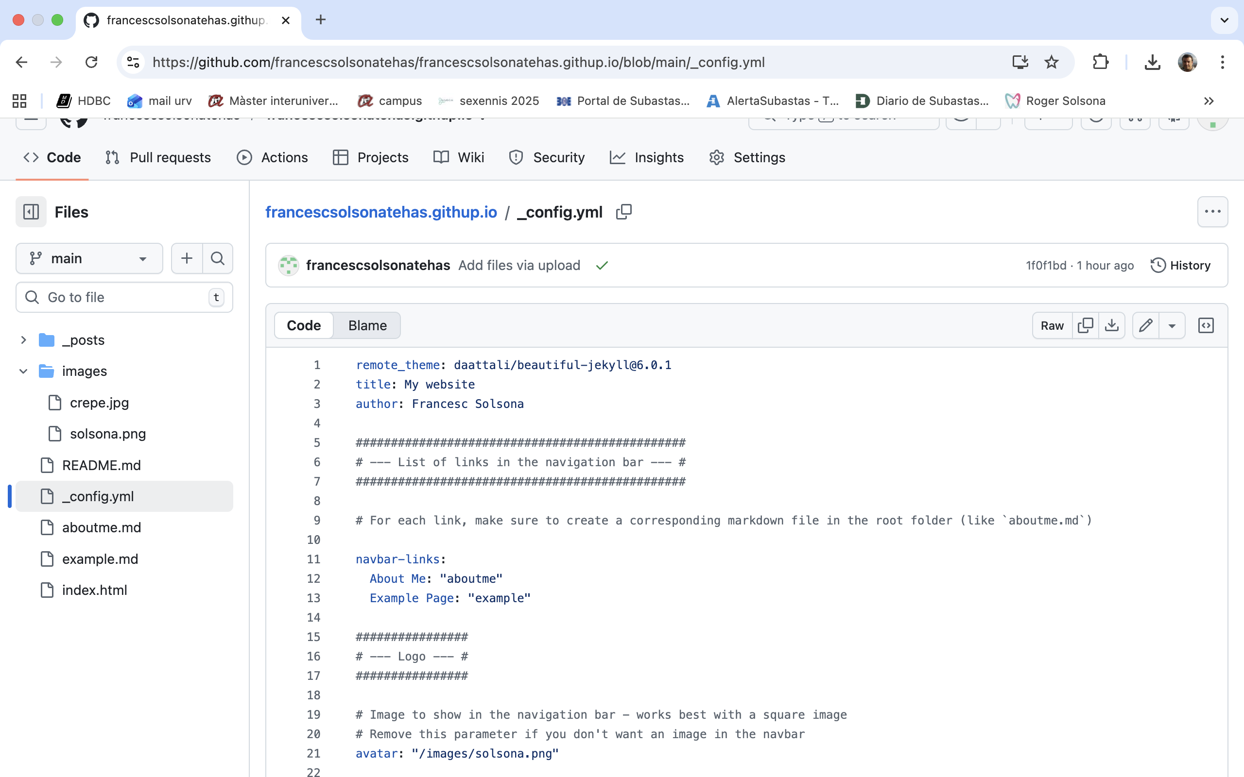 _config.ymland replacing the path. Notice it is just a string with the path to a file present in the repository, in this case, theimages/ferran.jpegfile. You can upload any image you want to the repository by navigating to theimagesdirectory and clicking the "Add file -> Upload files" button. If, for example, you uploaded a file calledmyavatar.jpg, you should change the path in_config.ymltoimages/myavatar.jpg. If you don't want to use an avatar image, you can remove the lineavatar: "/images/ferran.jpegfrom the_config.ymlfile.