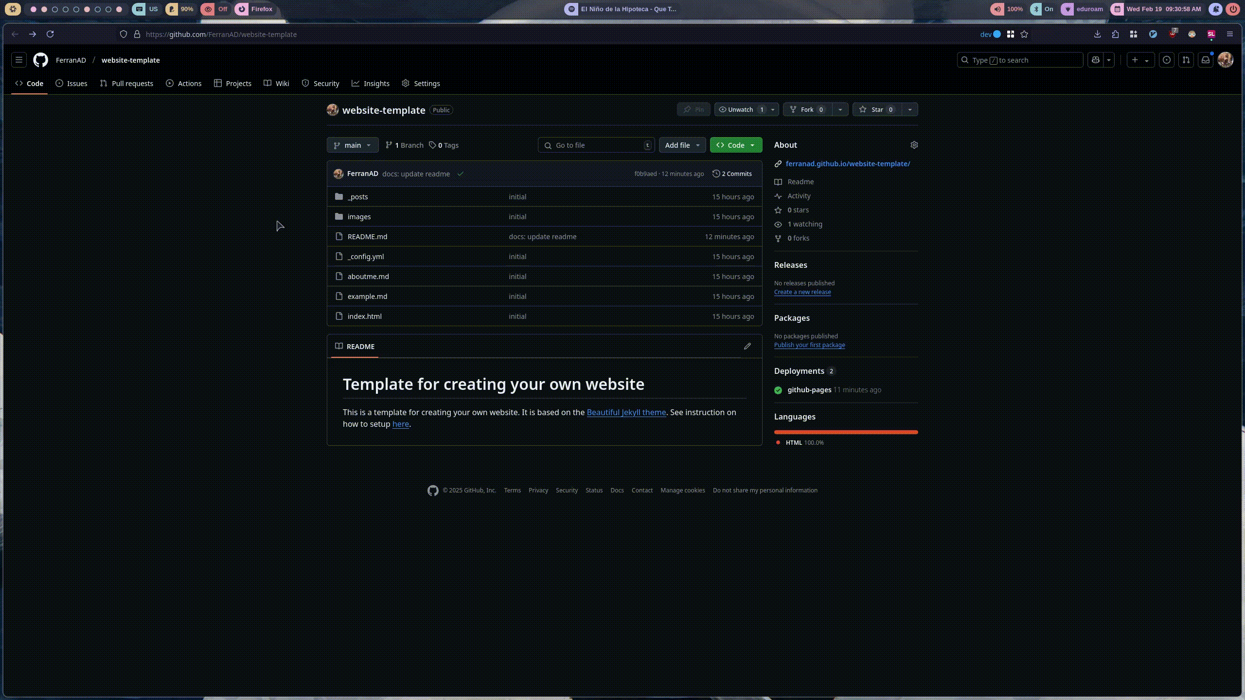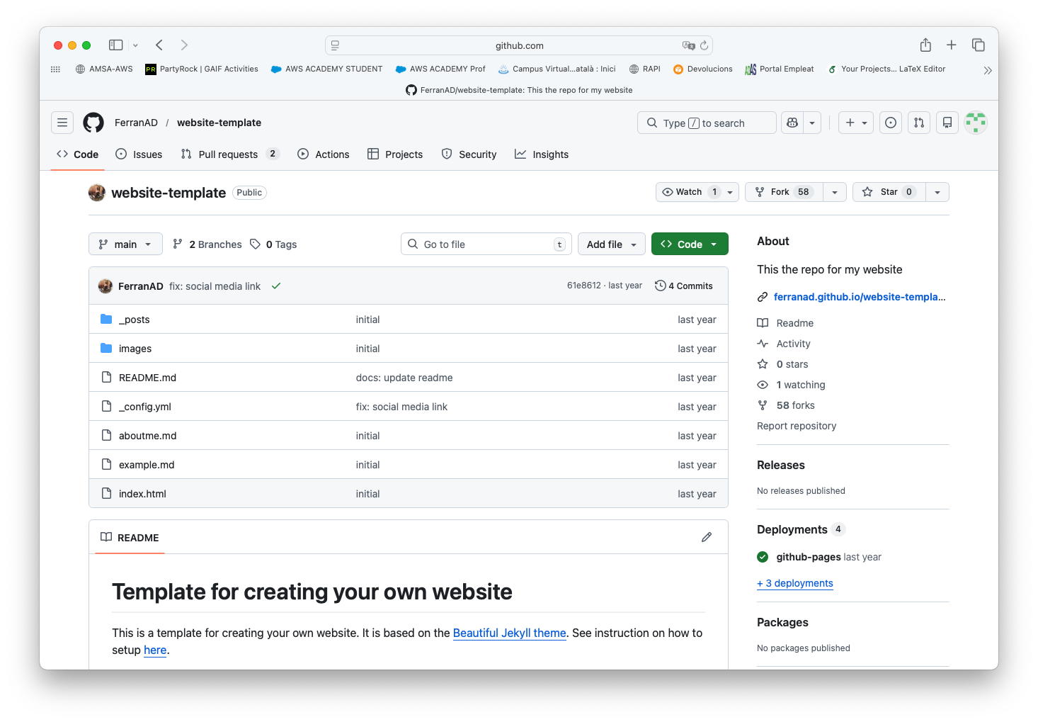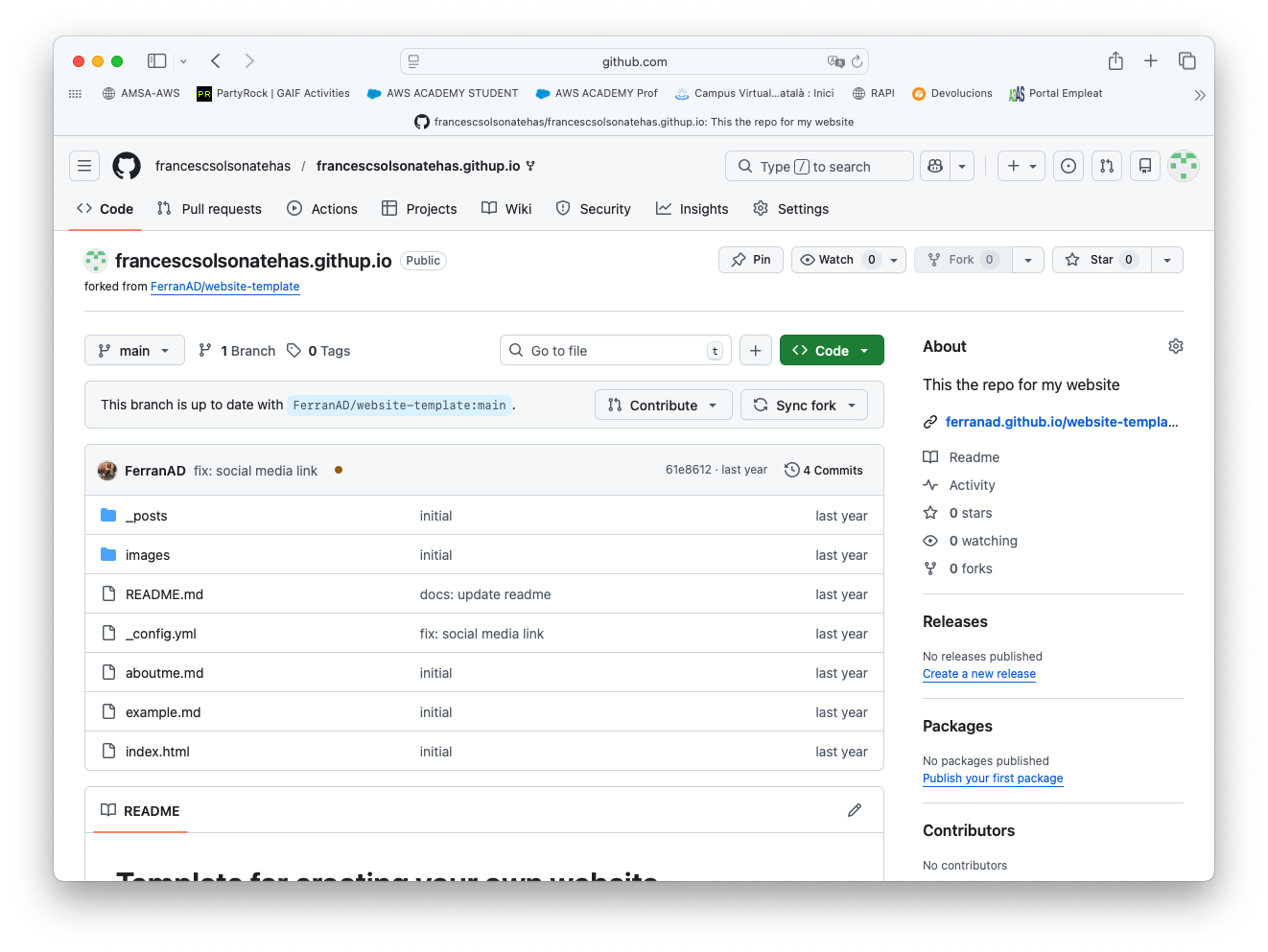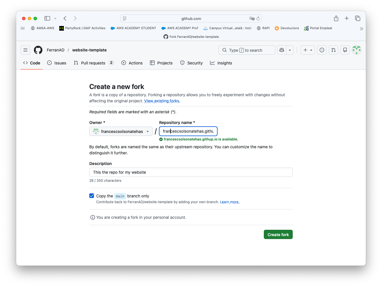- Fork https://github.com/ferranad/website-template to your GitHub account by clicking on the "Fork" button at the top right corner of this page.