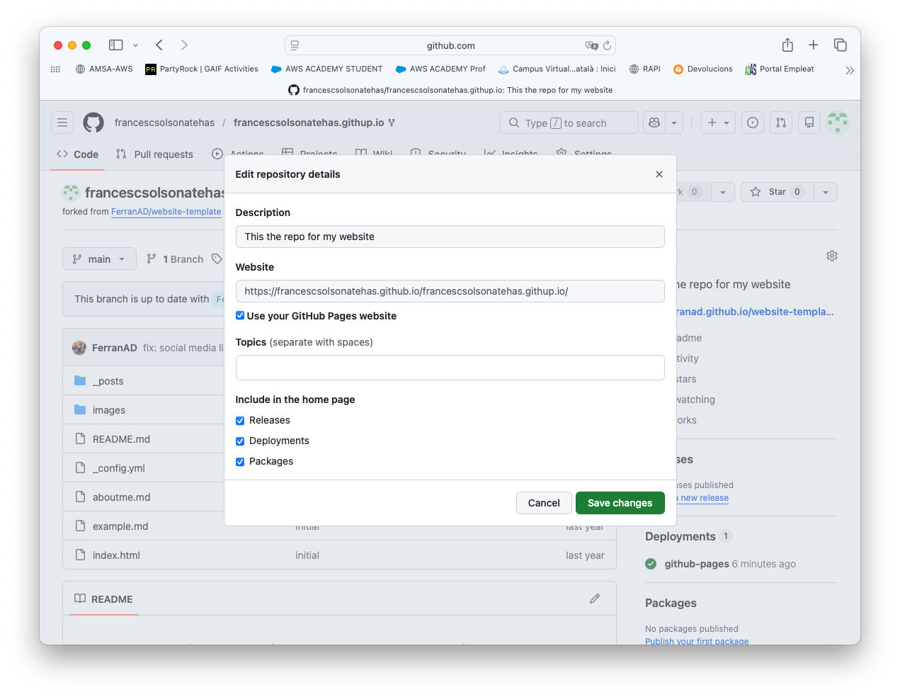 - You can optionally edit the repository description so it contains the URL of your website. This will make it easier for you and others to access your website from the GitHub repository page.